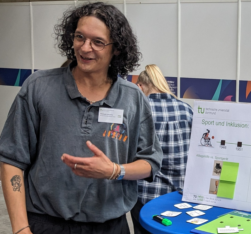 Studierende des Seminars „Inklusions- und Exklusionsprozesse im Arbeiter- und Leistungssport“ (Leitung Prof. Dr. Frauke Mörike) an der Fakultät für Rehabilitationswissenschaften nahmen einer Exkursion zu dem Turnier teil. So gab es nicht nur die Möglichkeit, packende Matches von Weltklasse-Athlet*innen bei toller Stimmung in der Jahrhunderthalle zu verfolgen und die Faszination des Rollstuhl-Basketballs selbst zu erleben, sondern auch aktiv zur Diskussion rund um das Thema Sport und Inklusion beizutragen: Im Ausstellungsbereich präsentierten die Studierenden ihre im Seminar erarbeiteten Inhalte als interaktive Quiz-Formate und luden Besucher*innen dazu ein, sich mit Fragen zur Inklusion im Sport auseinanderzusetzen.